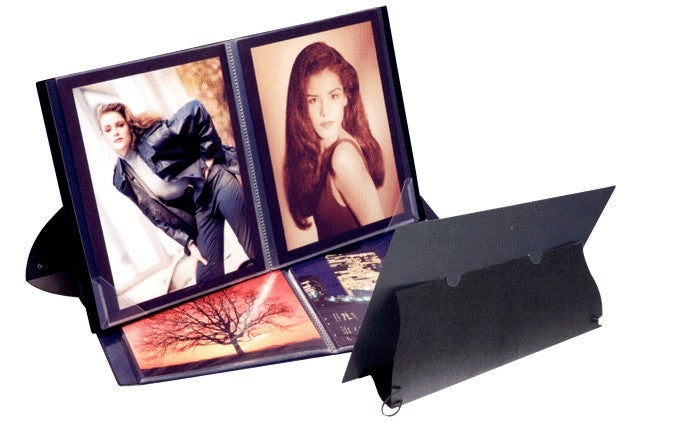 Display art and photos hands free! Ideal for commercial artists and photographers. The Itoya Easel Does It Art Profolio has an easy to use patented fold away easel built right into the profolio. It has a durable polypropylene cover, has acid-free black mounting paper within the pages and has an elastic fastener to keep the book closed.20 pocket pages with 40 views.